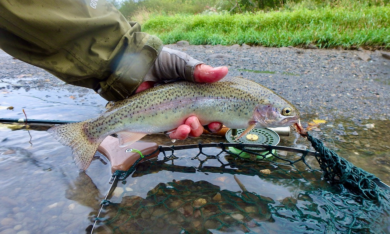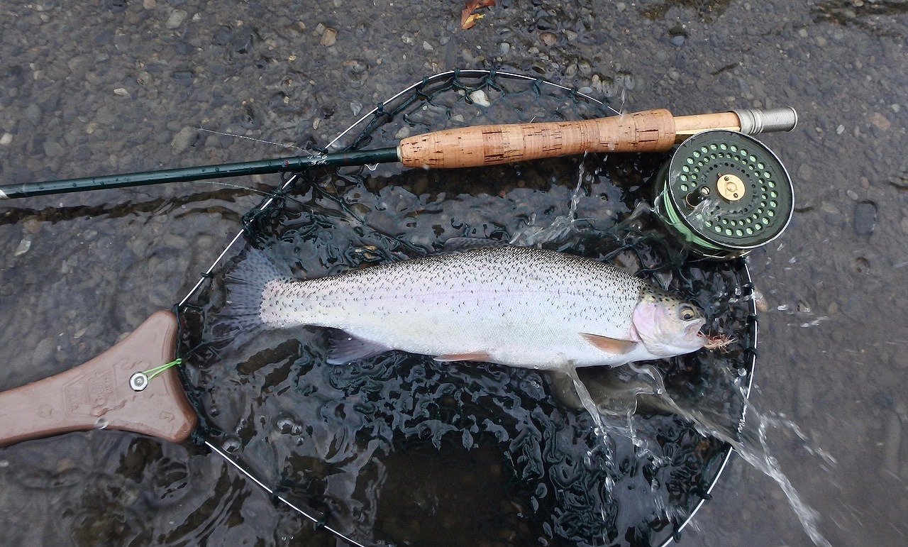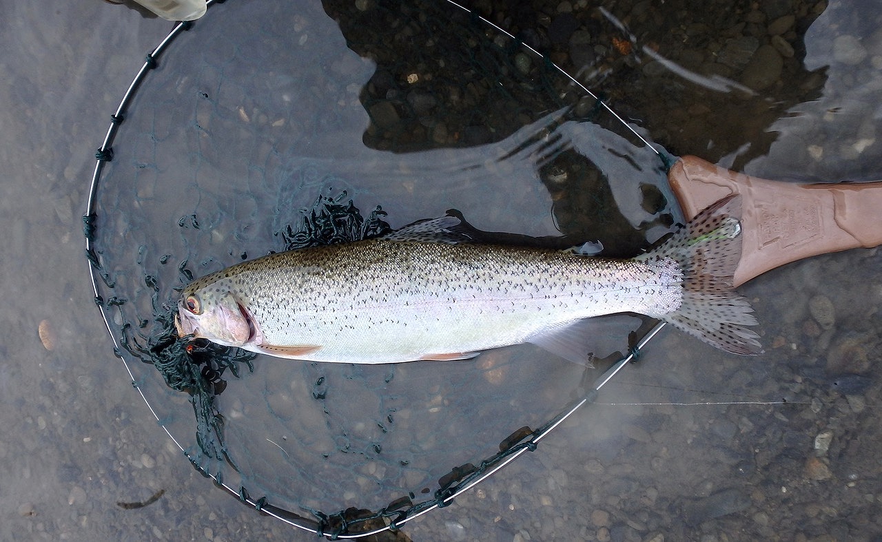 綺麗なニジマスを手にしたが、昨年取り損なったポイントで今年もヒッさせながら、何度もネットに入れ損ないフックアウトしてしまった。