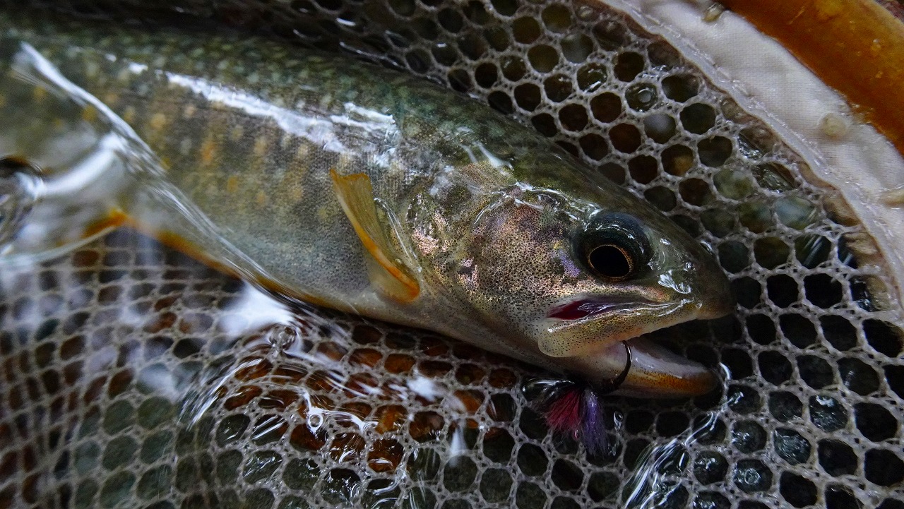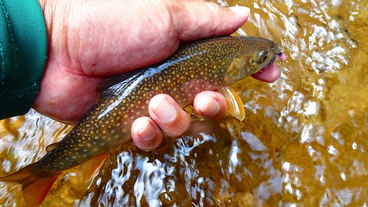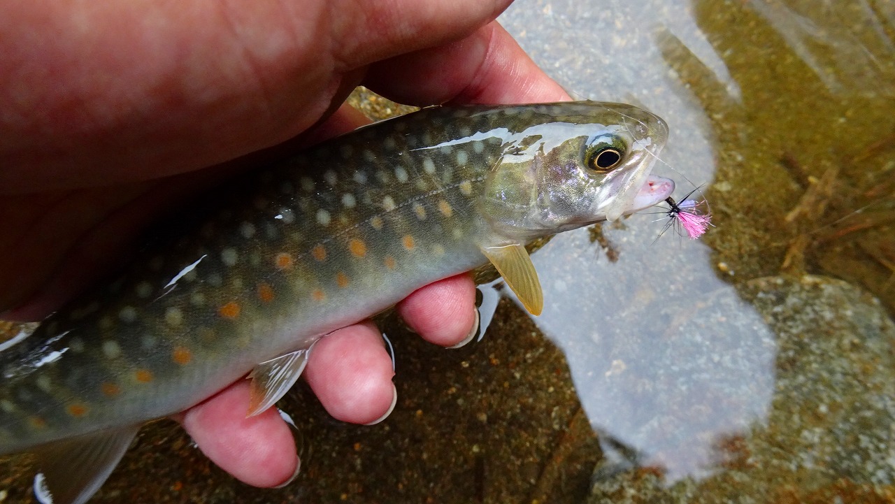 流れは細いですが滝壺はいい感じで水が溜まっています。とりあえず開きにフライを落とすと一発で食ってきました。