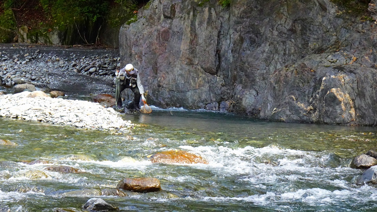 慎重に探っていくとくるぶしくらいの水深の流れから出てくれました。