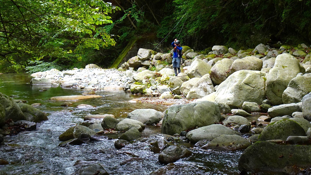 気を取り直して岩の後ろから距離を取って奥の流れを狙います。