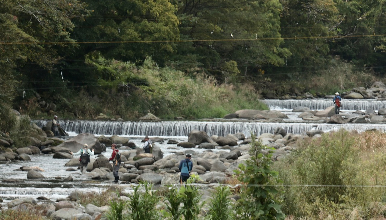 やっとの思いでUターンし少し下流の1台分停められそうなPに置き、支度を始めたながら川を覗くと釣り人で大混雑。
