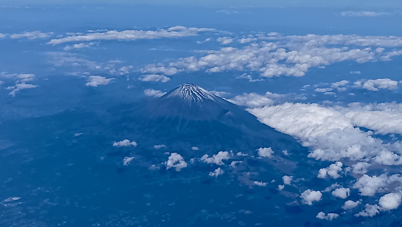 羽田を飛び立ってすぐ見えた薄雪化粧の富士山、例年より雪は少ないようだ。