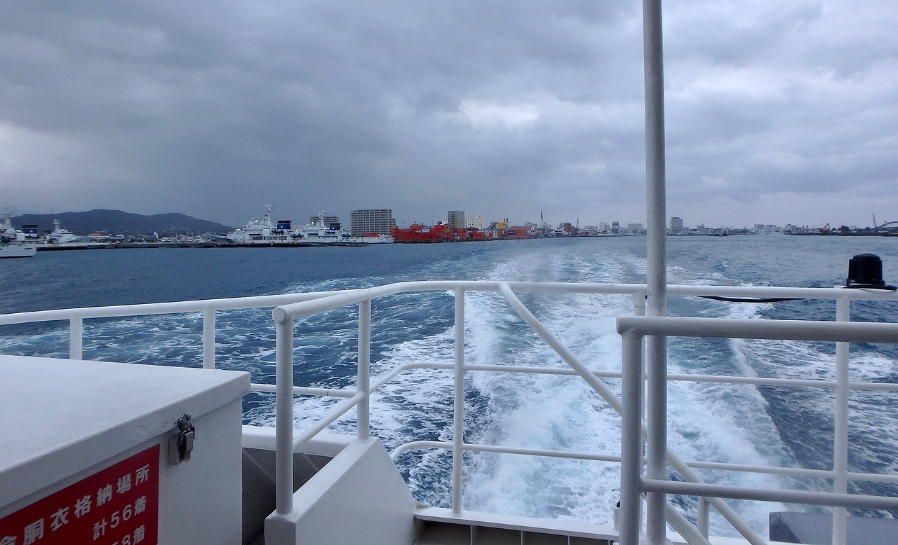 フェリーから石垣港が小さく見えるようになると竹富島が目の前に見えてくる。