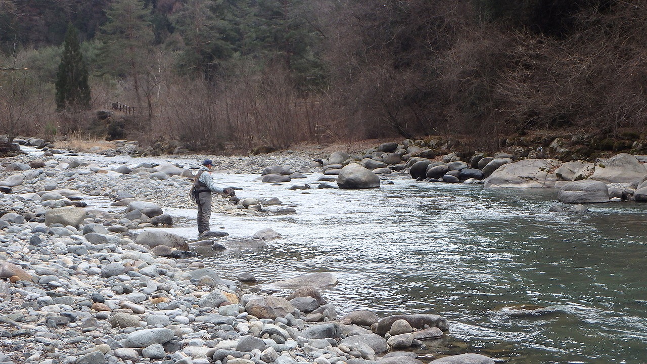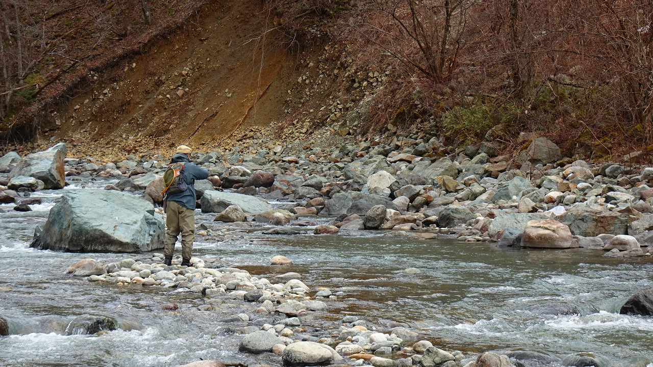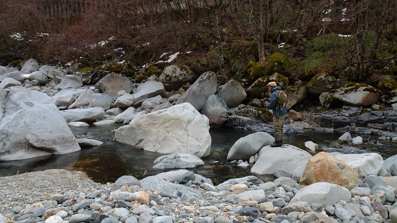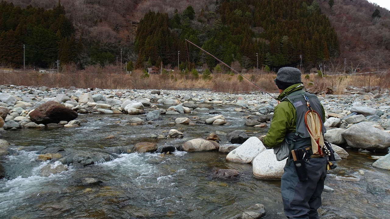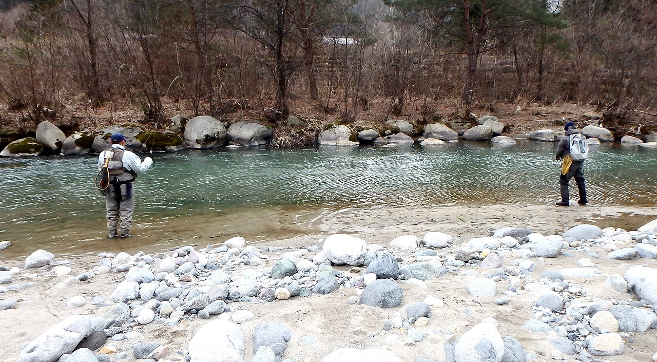 ライズを見たのは1カ所しだけ、瀬を叩いても流れを狙っても魚信はなく年々釣果が遠のいて行く解禁当初の蒲田川。