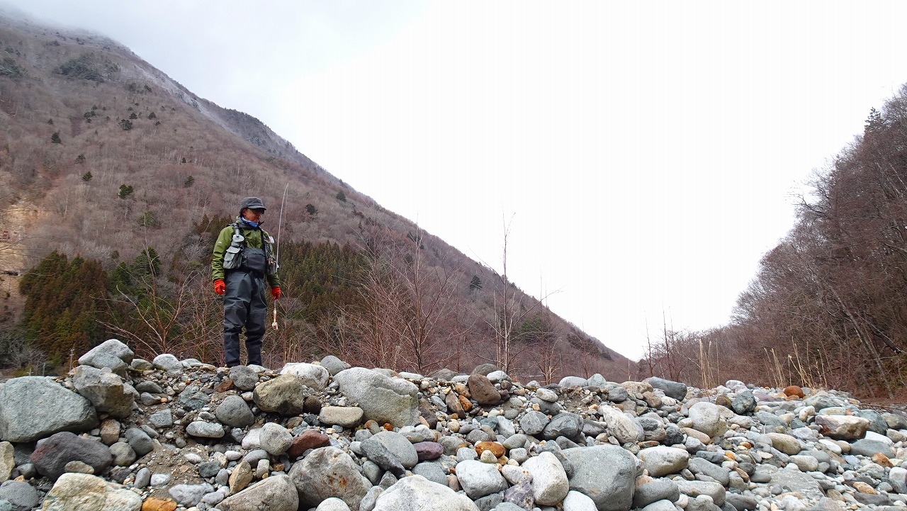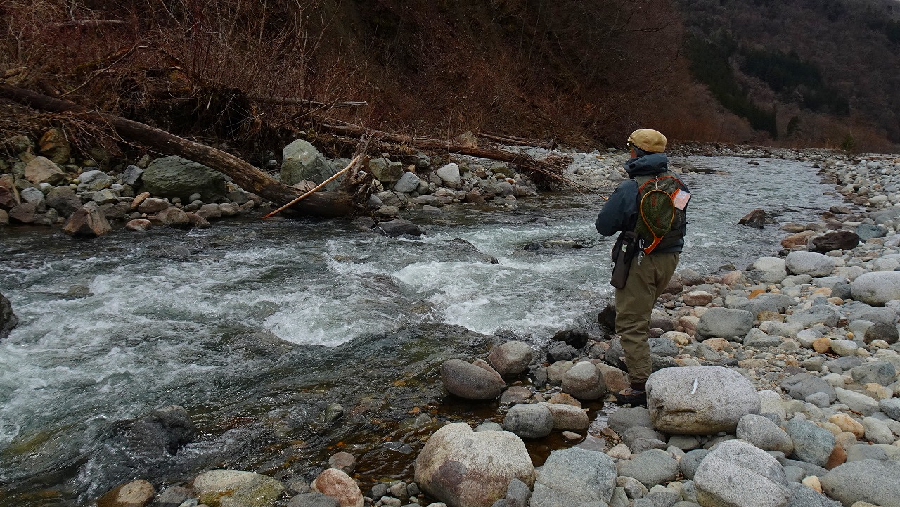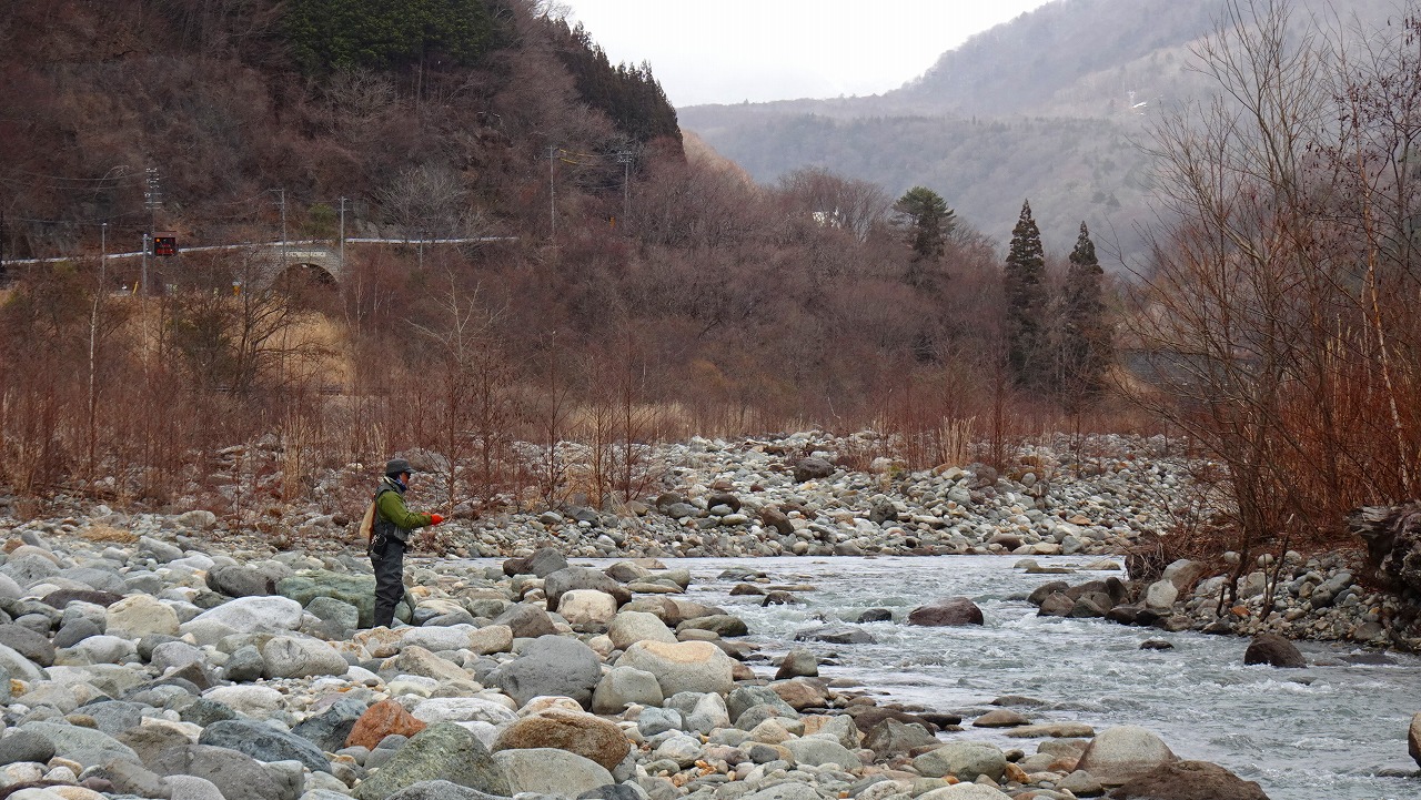 現地に着き川の様子を見ると事前情報で水量が少ないと言う事だったが、釣りをするのには全く問題なく天気も曇りで時々雪が舞う蒲田川日和だ。